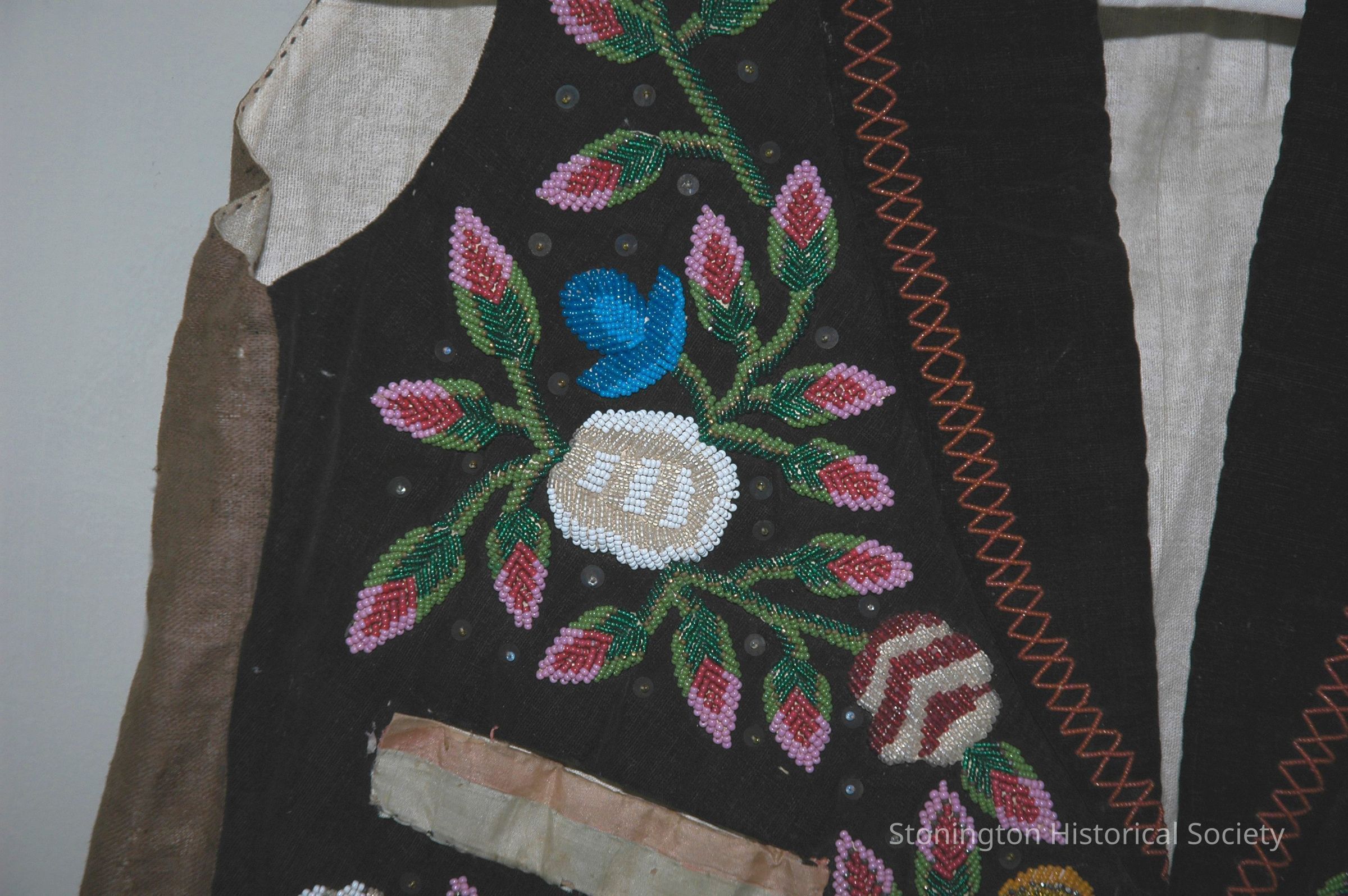 beaded vest in floral design brown velvet sown with pink,blue, yellow and white beads brown back off white lining