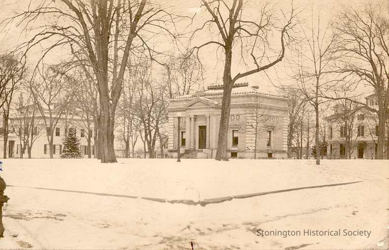 Stonington Free Library looking north during winter with notes on back