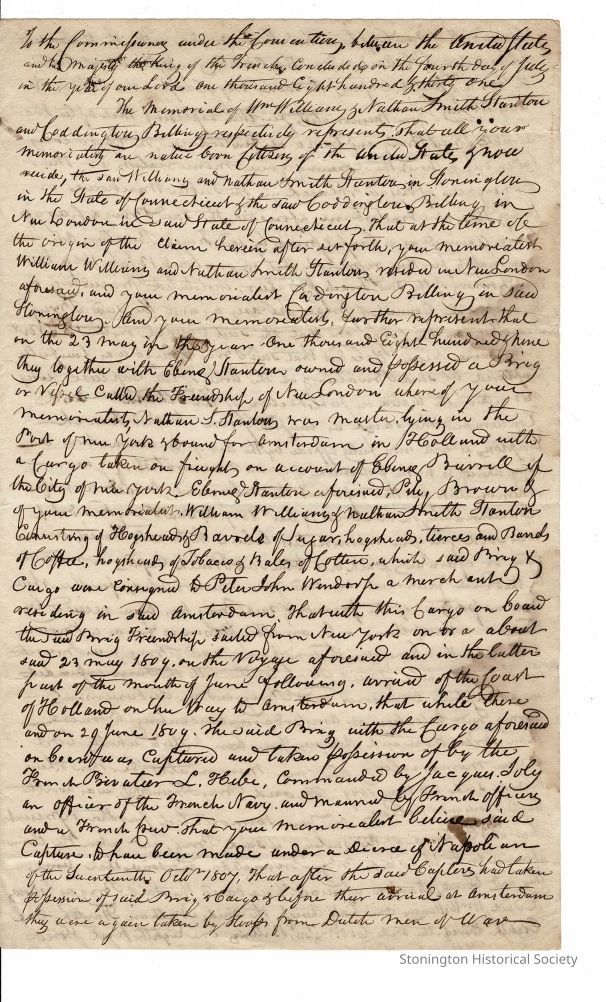 An account by the owners of the brig "Friendship" of their ship being ransacked by privateers off the French coast on their way to Amsterdam. The event was recorded by William Williams, Nathan Smith Stanton, Coddington Billings and Ebenezer Stanton (who at the time of the testimonial had died). The ship was captured in 1809, and the men still alive request assistance for their losses from the Commissioners. A transcription accompanies the document.Collection