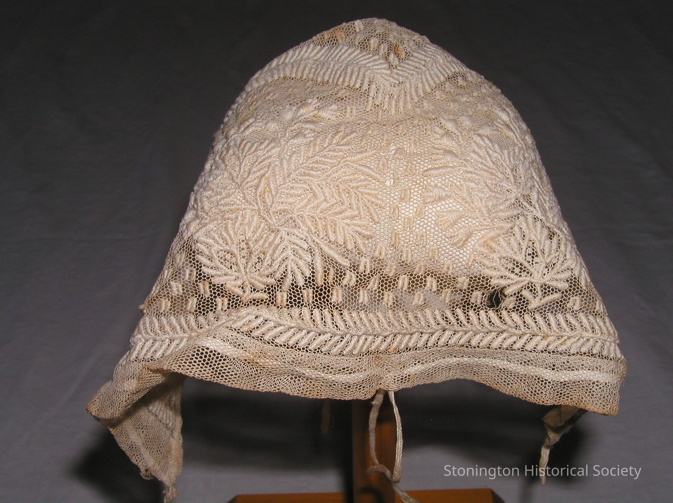 infant's lace cap handmade lace clusters of ferns and possibly thistles 2 separate sets of drawstrings; front and back loops(one missng) at corner for ties