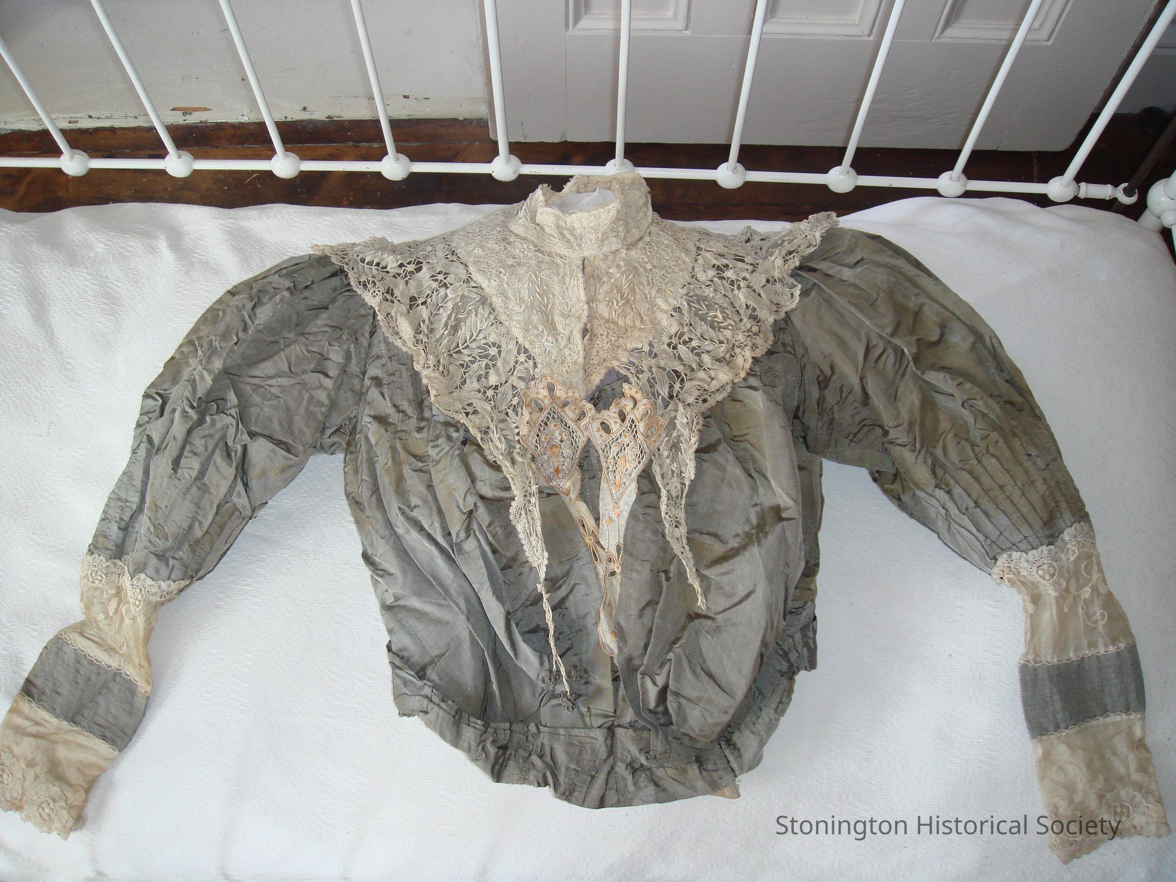 a- Bodice decorated with machine laces and embroidered medallions and hand sewn tucks