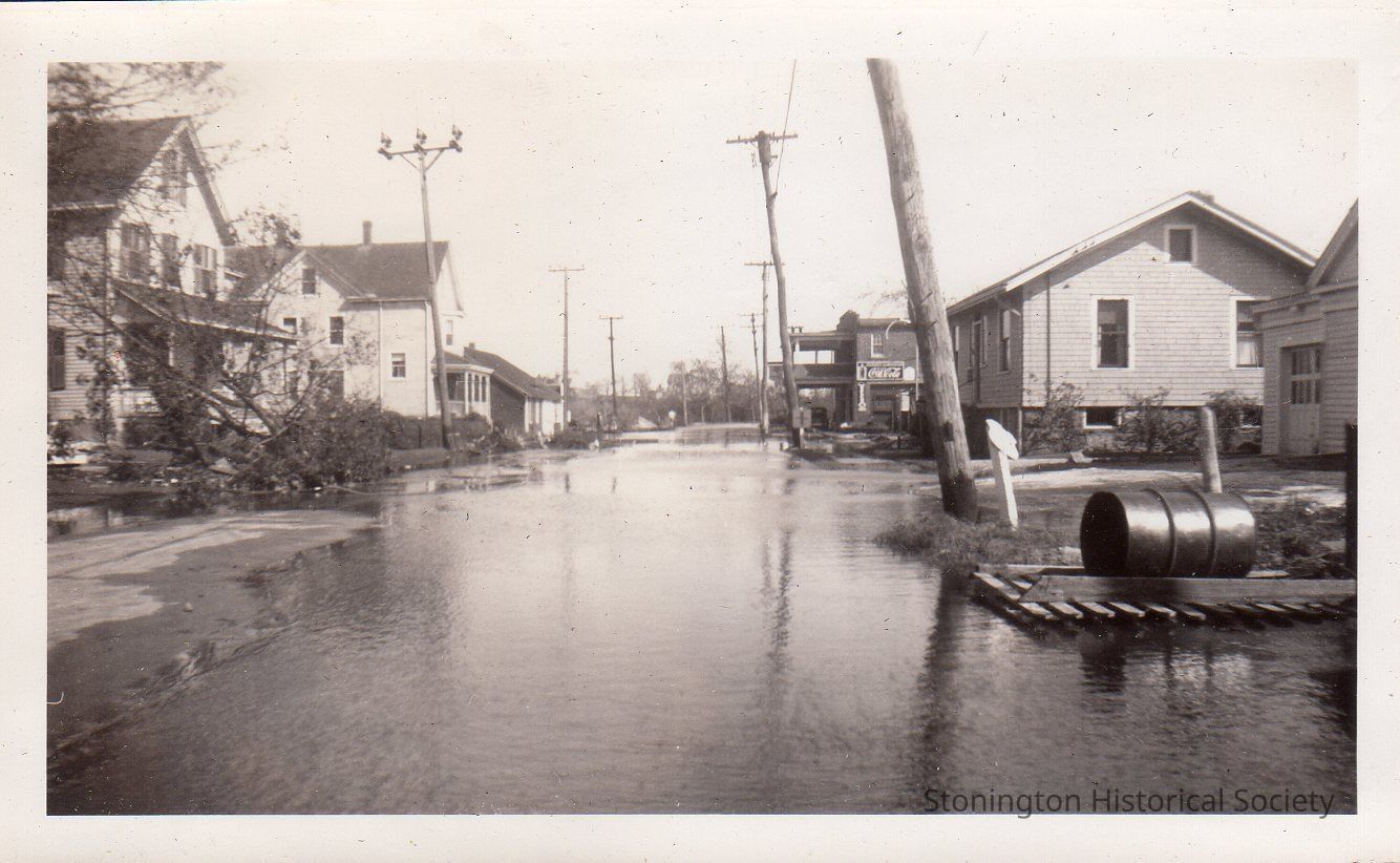 Black and white photograph of flooding on Williams Street from the 1938 Hurricane. From photograph album of Bertha D'Amico.