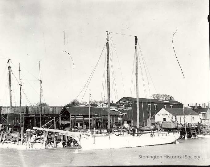 Sloop "Gazelle" at Pendleton's dock with fish market, Stonington CTEntry/Object ID