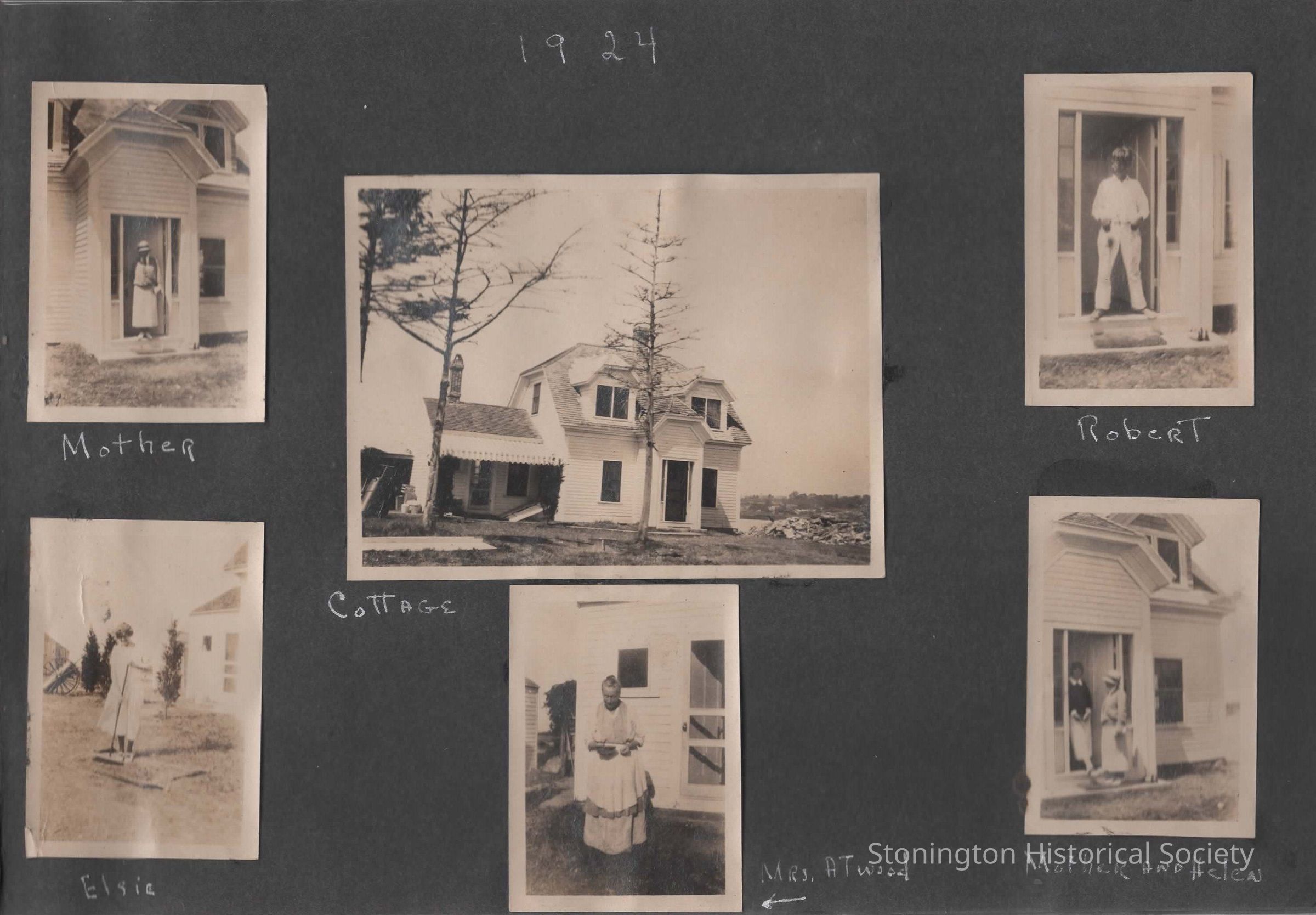 Photo album, black and white photographs (and two news clippings) glued to black paper, photos of houses and property on Elihu Island, 1924-1925. Renovation of "The chapel" and its subsequent movement over to and addition onto the main house. Also includes pictures of Robert and Carolyn Johnstone and their children.