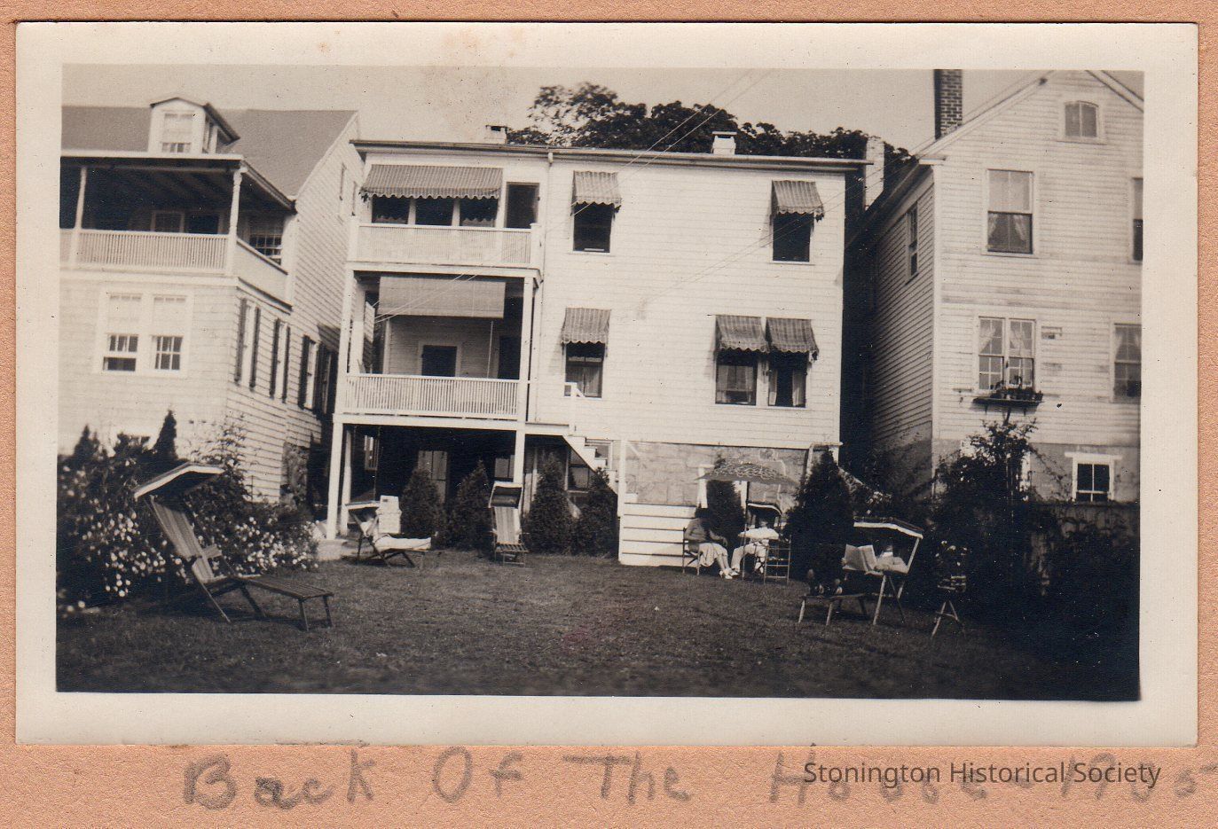 Black photograph album/"scrapbook", 11.5" x 14.5", full of photographs of damage from the 1938 Hurricane with captions handwritten by Bertha D'Amico. Views of Stonington and Mystic, before and after the hurricane. Includes a mix of professional photographs and personal photographs taken from the D'Amico house at 92 Water Street. Launching of the RUSSELL S. from the D'Amico's backyard. Photographs cataloged individually (2022.204.59 - 2022.204.117).