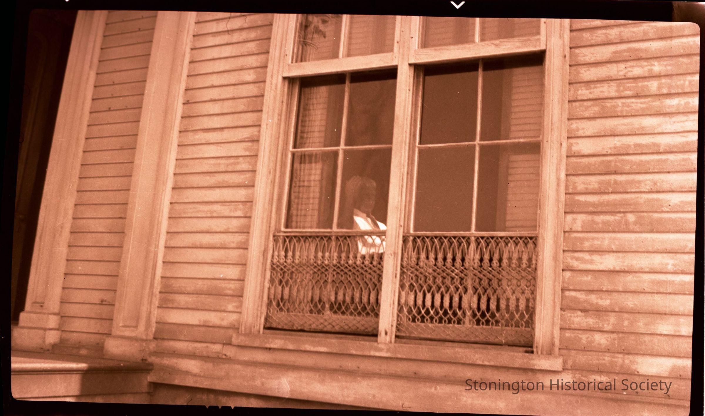 Alexander Palmer Loper at window inside Palmer House (Pine Point)