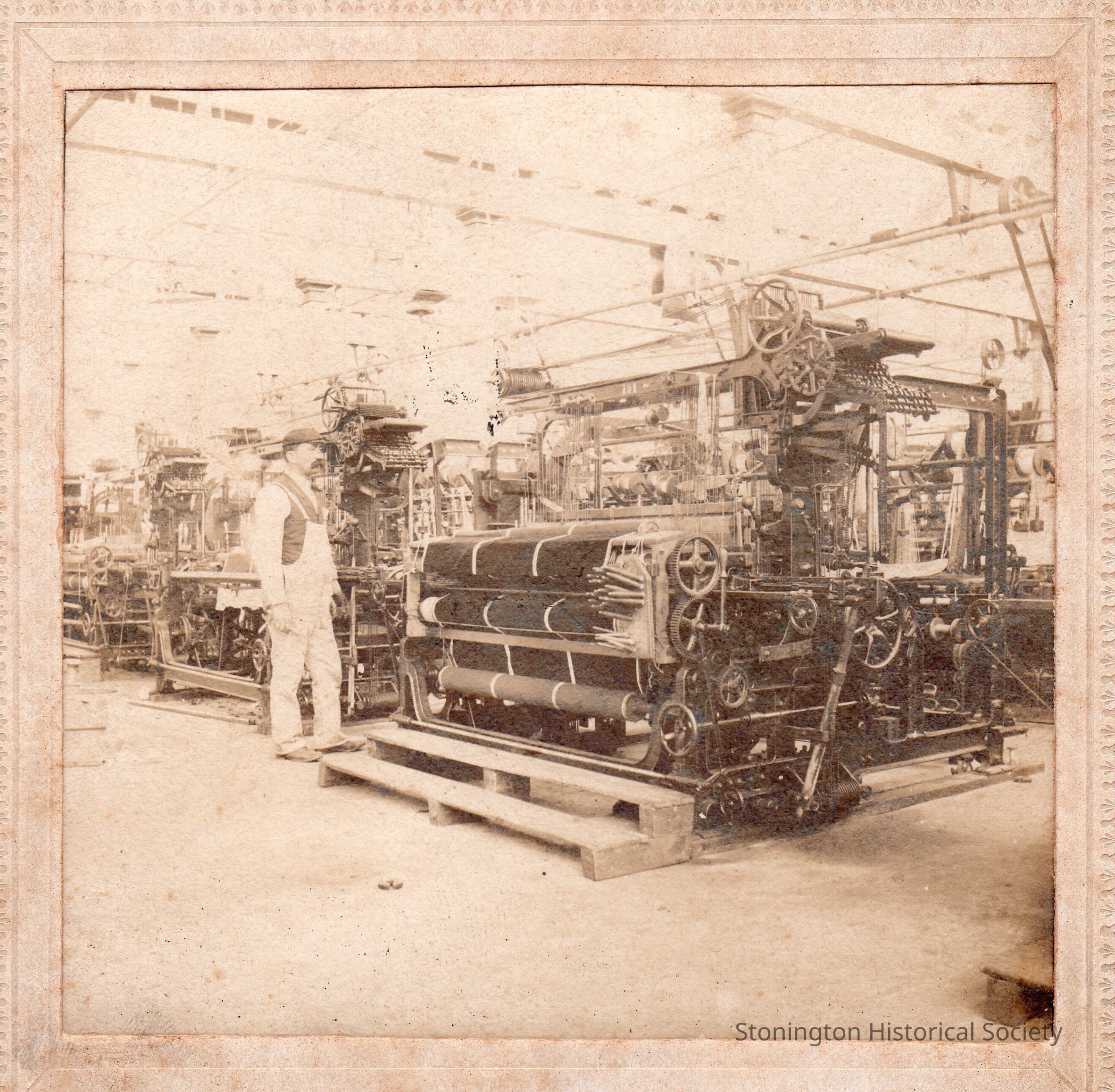 Black and white photograph mounted on board, "Scheibner - Head of weave shop with 1st machinery imported from Germany, 1892," photographed by George A. Hyde, Stonington, Conn. Part of a collection of previous exhibit photographs from the Lighthouse Museum.Collection