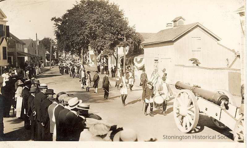 People at parade on Elm Street showing one of the cannons during Celebration of the Battle of Stonington, 1914. Per note on back, Carey Maine, GAR veteran, as drummer and others representing American Volunteers of 1814
