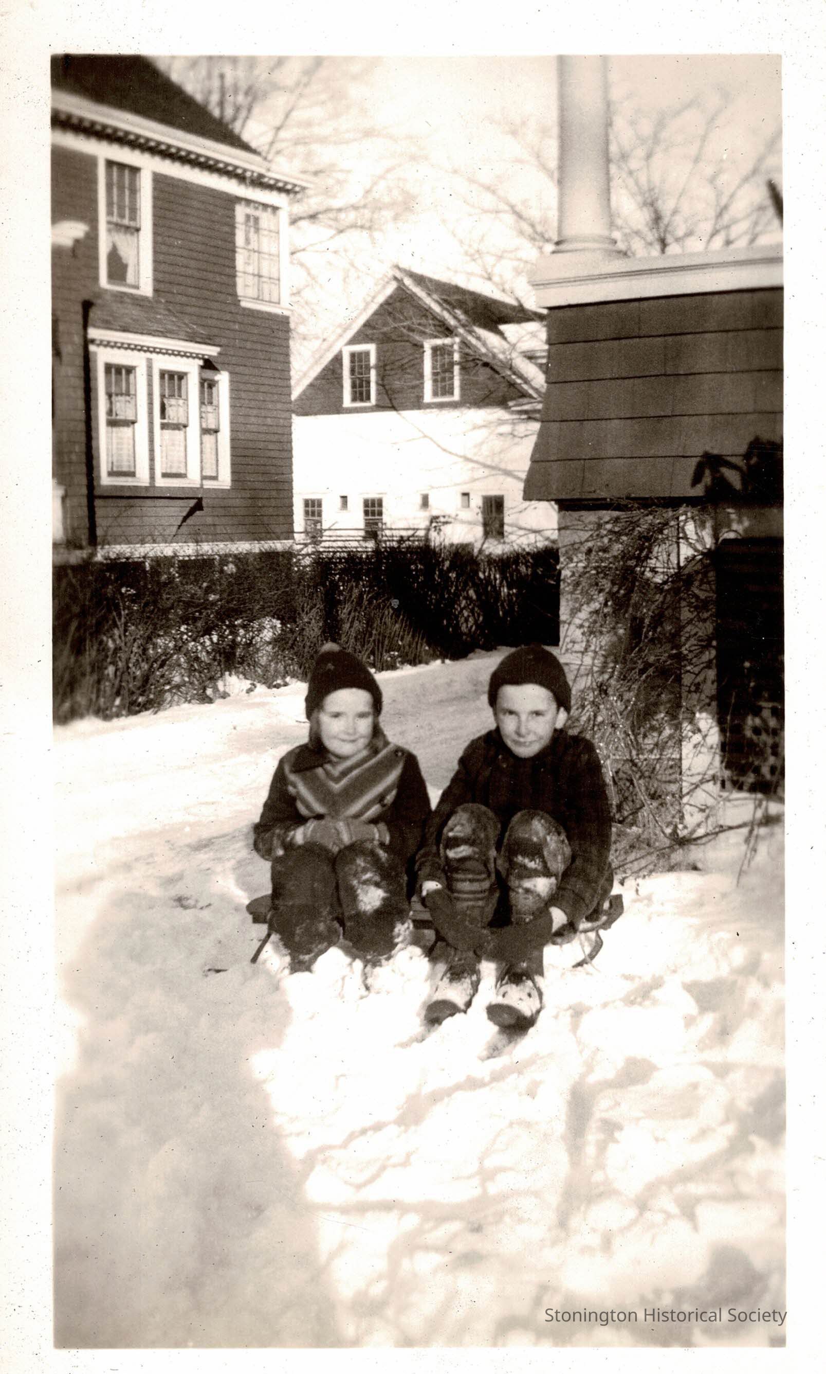 Black and white photograph of Andy Perry (1927-2014) and his little sister Ella Perry (1931-2004) in front of their home on Main Street in Stonington Borough around 1935. Andy and Ella were the children of Burrows Perry (1897-1990) and Mildred Lanphear Perry (1896-1985).Collection