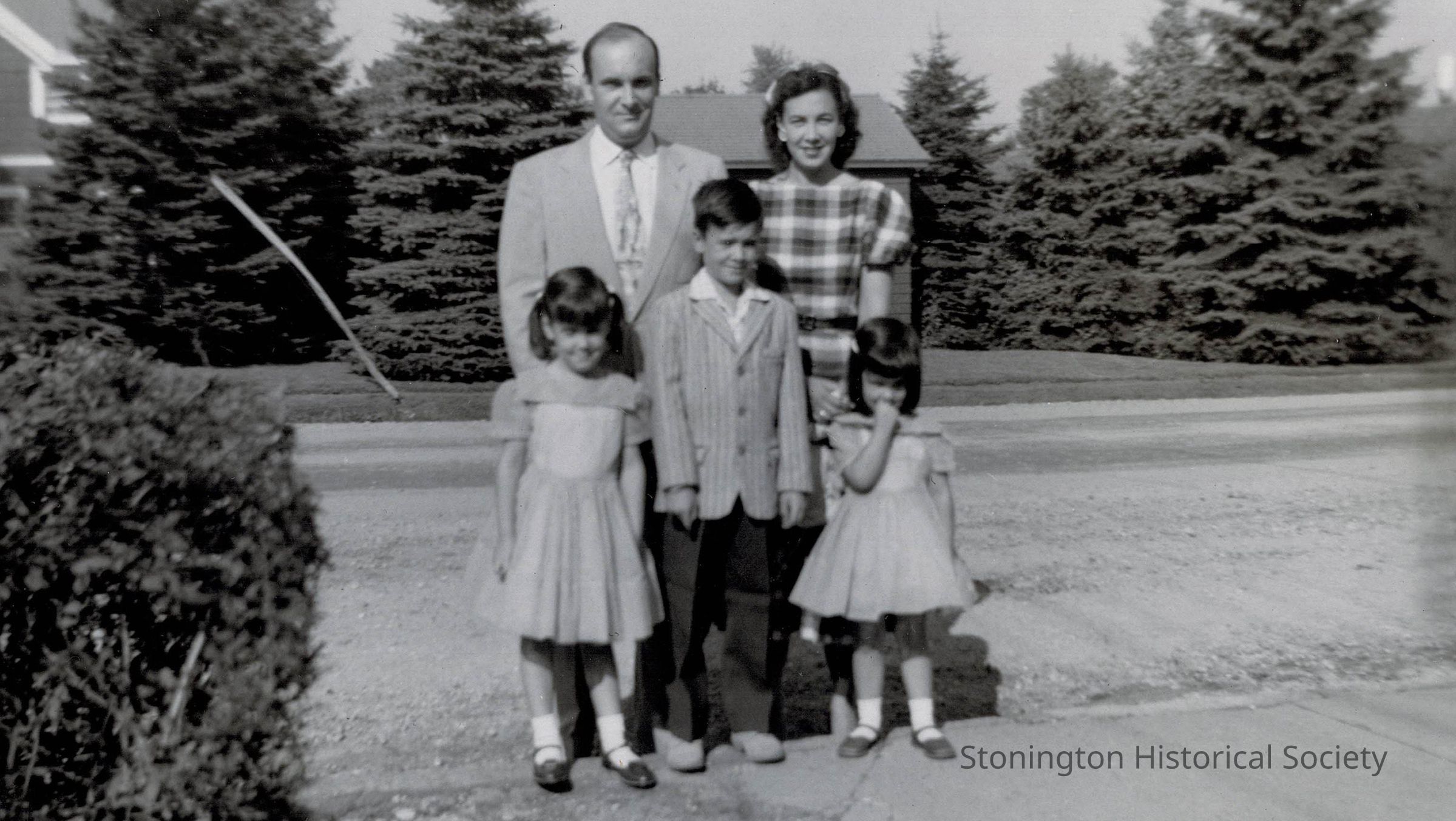 Photograph showing Andy Perry (1927-2014) and his wife Eleanor Reilly Perry (1928-2017) with their three children: Ellie, Andrew, and Barbara in October 1959. Andy Perry is well remembered in Stonington as the proprietor of many years of the Stonington Lumber Company.Collection