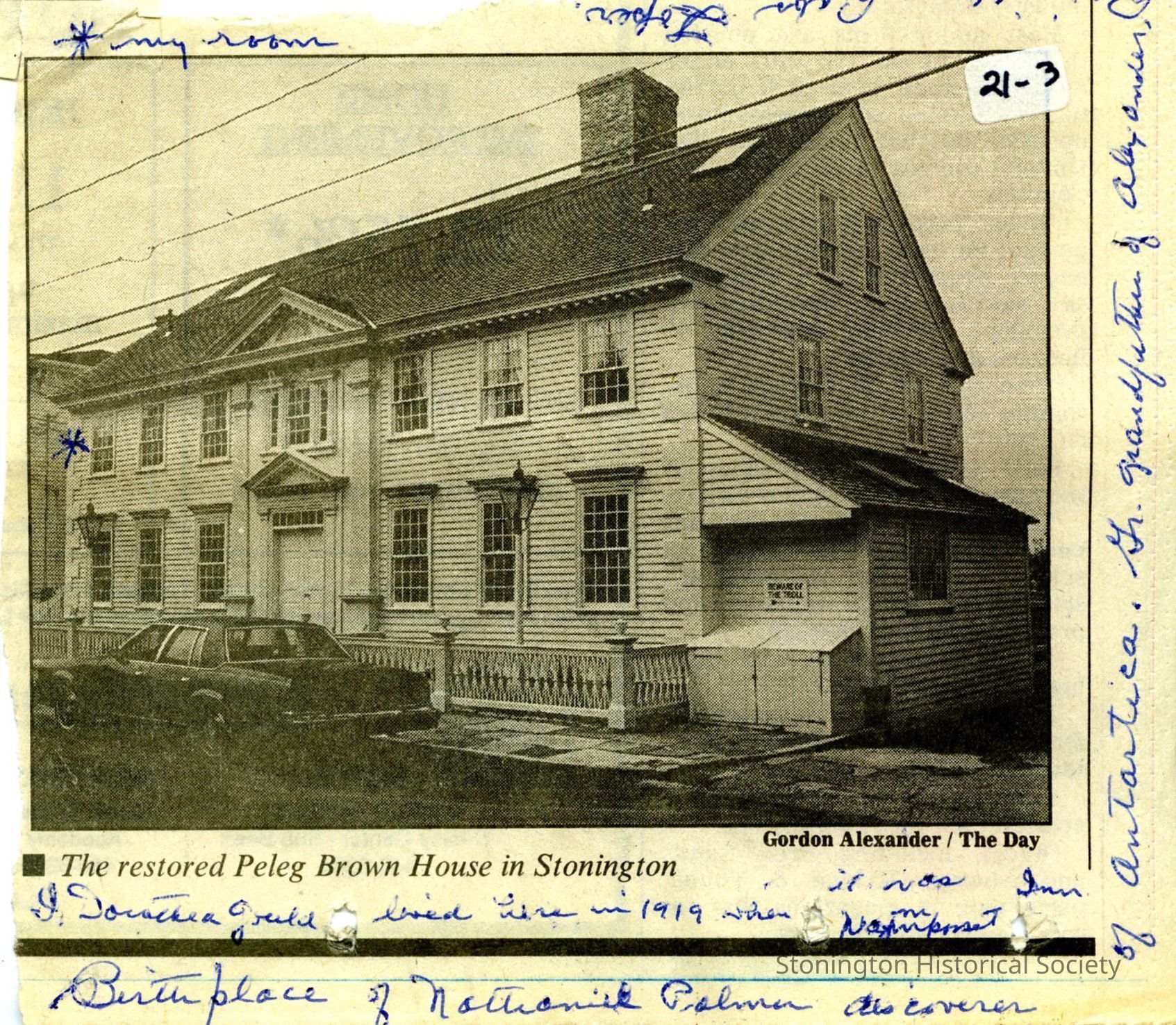 Part of article and picture of restored Peleg Brown House in Stonington including letter to the editor of the Day from C. William StammCollection