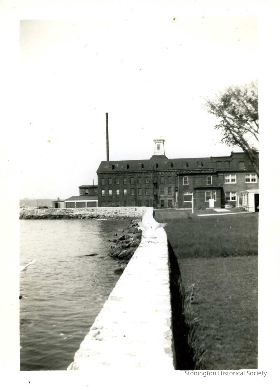 A small black and white photograph of the Atwood Machine Company from further south on Water Street. The view is unobstructed, and shows some of the smaller outbuildings that were behind the factory.Collection