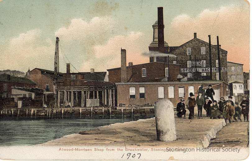 Note included: "Atwood-Morrison shop from breakwater 1907 - bollards for mooring ships in early days. Believe tower torn down in 1935 possibly not til hurricane - perhaps someone has this information. In 1851 the first factory bldg. before the Civil War, manufactured horseshoe nails and later a company which made cheap jewelry sold to ship captains to be used as barter with the South Sea Islanders for copra. During the Civil War taken over by the Joslyn Firearms Co. in 1861, which produced carbines for the Union cavalry. After 1866 the bldg. was purchased by the Atwood Machine Co., makers of textile machinery. Merger with Plax to become the home of plastic btls. now Monsanto. Old times affectionately?? call the plant "the shop". Also home of Universal Winding and Hartford Empire. Expansion in 1886 included the purchase of two Trumbull St. lots for employees' tenement houses and the C. B. Crandall sailloft and wharf for the twisted silk factory. Atwood Co. incorporated as Atwood Machine Co. in 1896 and at completion of factory bldg. a reception was held."