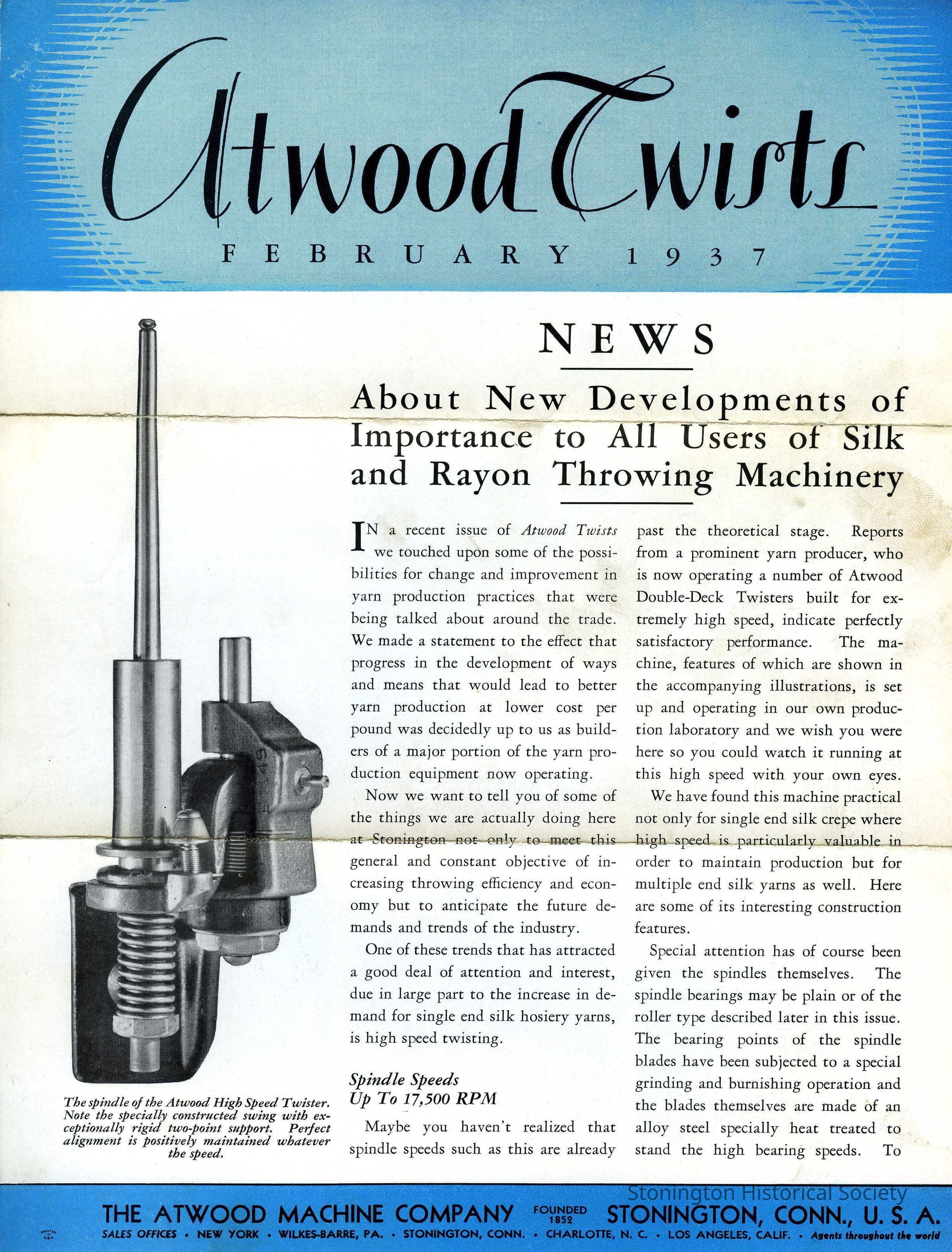 Monthly newsletter published by the Atwood Machine Company, printed in February 1937. This four page booklet features black and white photographs and publicity and explanation of new inventions and parts for the products. Articles in this issue include: News About New Developments of Importance to All Users of Silk and Rayon Throwing Machinery; A New Atwood "5B" That Produces any Shape of Package Including a Direct Knitting Package; Atwood Announces Important Additions to Executive Personnel.Collection