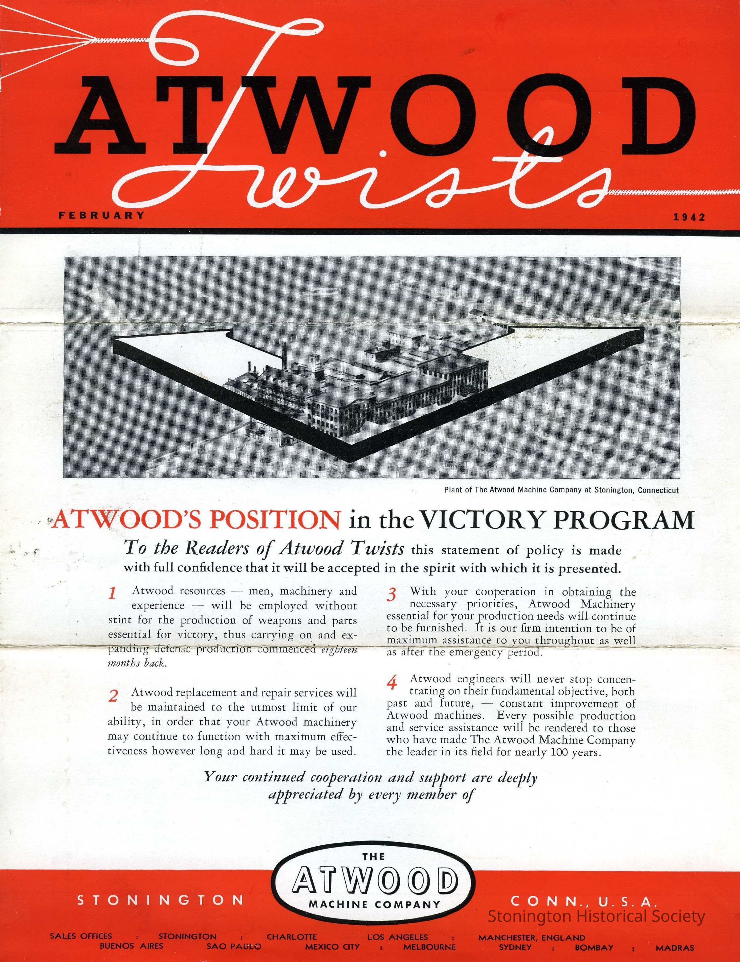 February 1942 edition of the monthly newsletter published by the Atwood Machine Company. The front cover features Atwood's position in the Victory Program for World War II. There is some brief information on their machinery and the welcome of a new partner, Guyan Mills.Collection