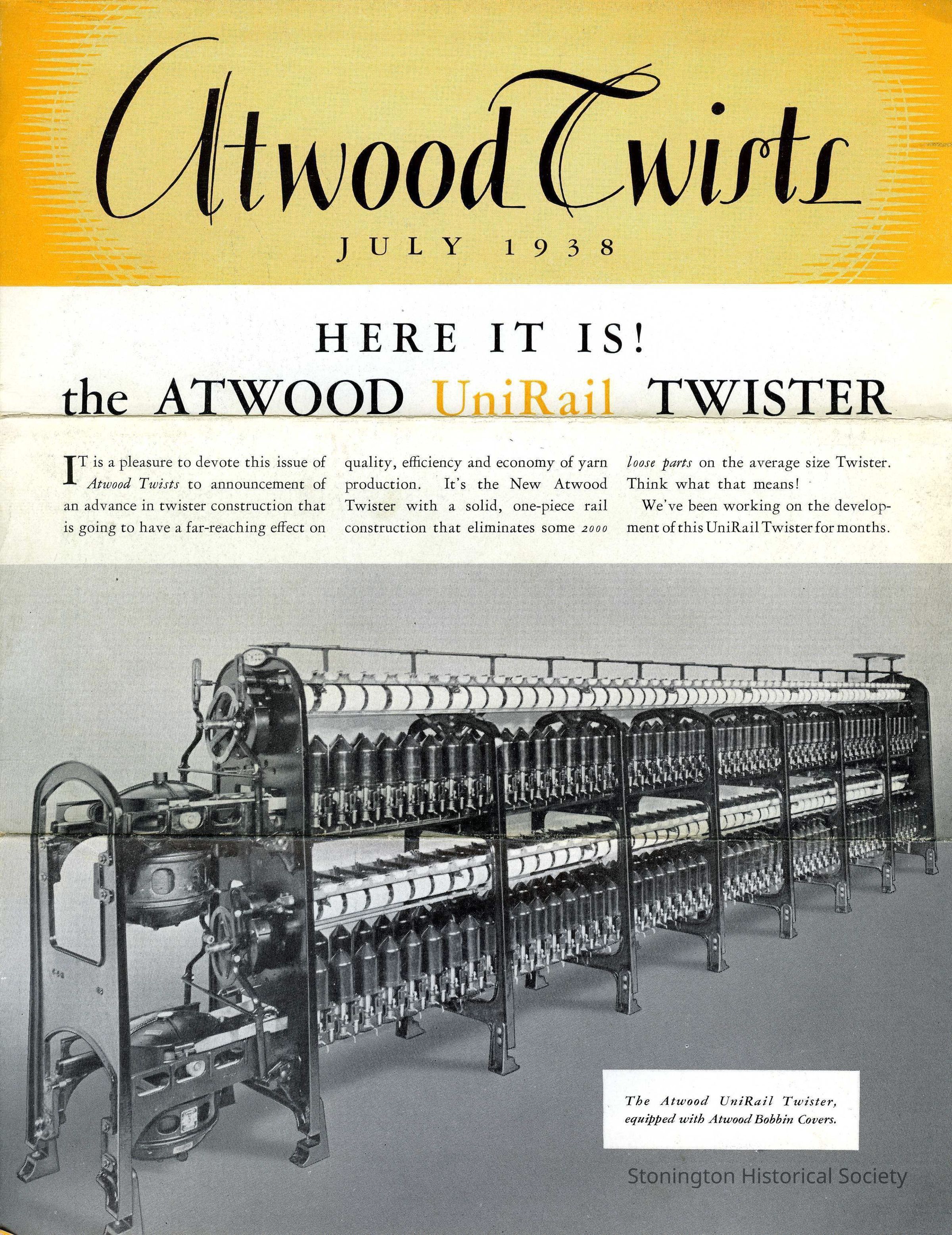 July 1938 monthly newsletter published by the Atwood Machine Company. The four page booklet has black and white images of the machinery and newly developed parts. A few short articles are written, publicizing and explaining their products. Articles in this issue include: Here It Is! The Atwood UniRail Twister; Why the 5B Gives You Even Twist, Full Bobbins or Empty.Collection