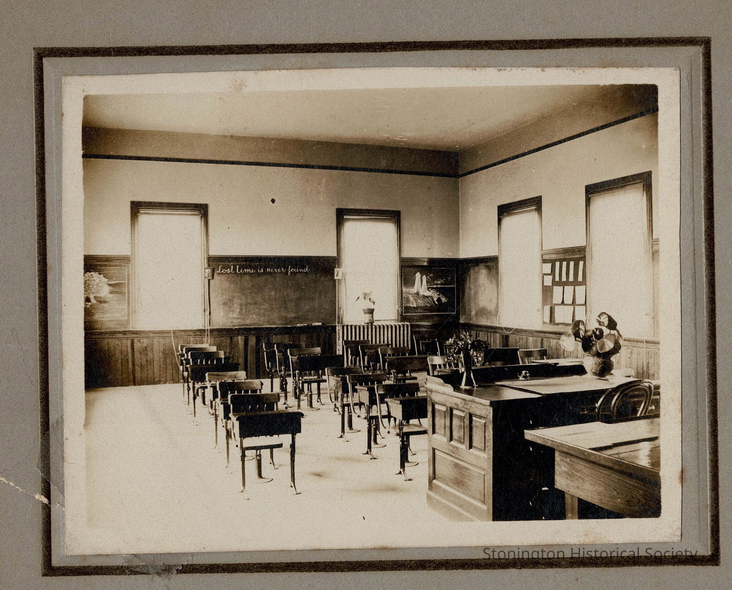 Interior of the Avondale Schoolhouse in Watch Hill, RI. Photograph is probably from around 1900. The town of Avondale was renamed from "Lotteryville" in 1893. Most likely taken by a member of the Lanphear family, which owned a livery at the waterfront.Collection