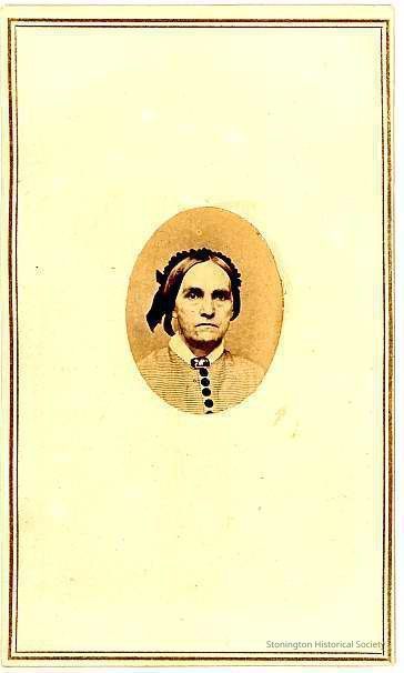 1 1/4 x 1 oval portrait in 4 x 2 1/2 CDV of unidentified woman, light striped dress, black buttons, dark bonnetCollection