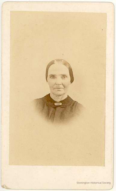Head and shoulders of unidentified middle aged woman wearing black collar and dress and brooch.