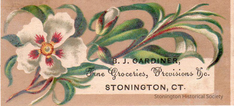 Trade Card, "B.J. Gardiner, Fine Groceries, Provision, &c., Stonington, CT." Byron J. Gardiner had a grocery store at 10 Elm Street in Stonington Borough.