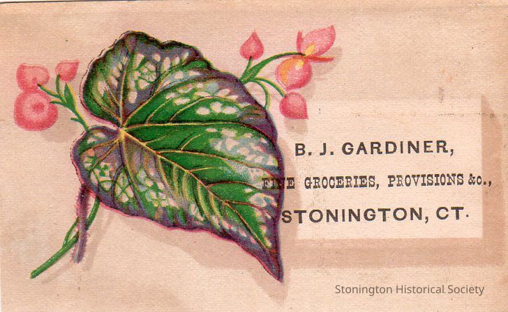 Trade Card, "B.J. Gardiner, Fine Groceries, Provision, &c., Stonington, CT." Byron J. Gardiner had a grocery store at 10 Elm Street in Stonington Borough.