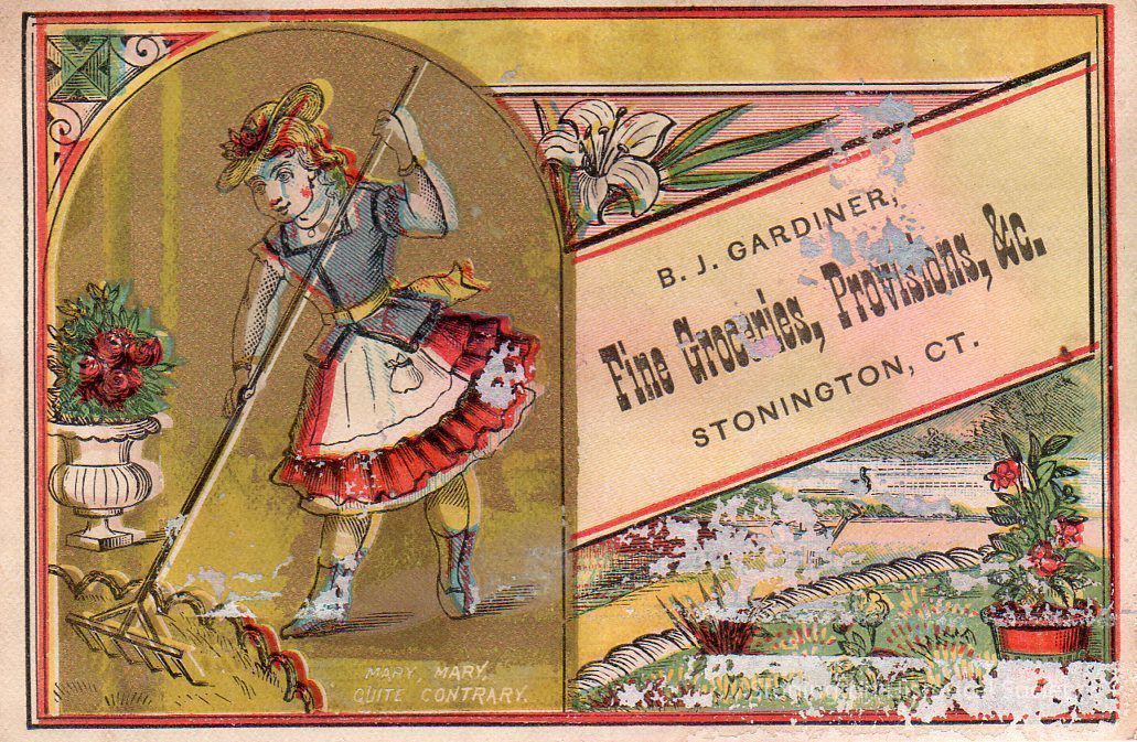 Trade Card, "B.J. Gardiner, Fine Groceries, Provision, &c., Stonington, CT." Byron J. Gardiner had a grocery store at 10 Elm Street in Stonington Borough.