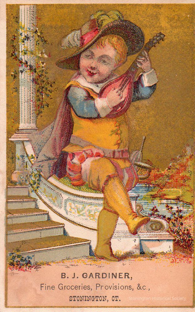 Trade Card, "B.J. Gardiner, Fine Groceries, Provision, &c., Stonington, CT." Byron J. Gardiner had a grocery store at 10 Elm Street in Stonington Borough.