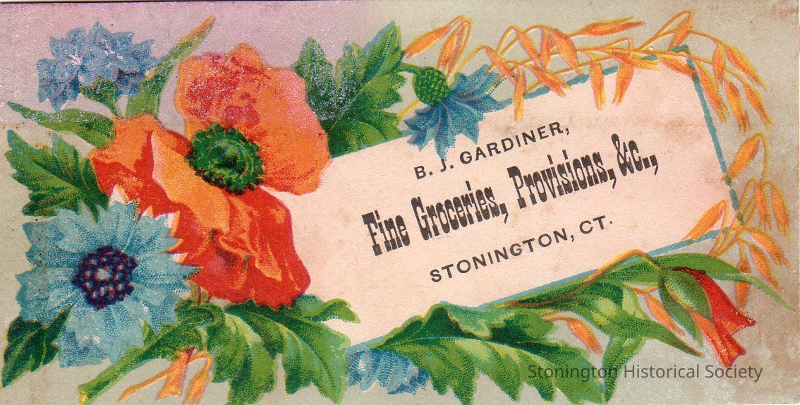 Trade Card, "B.J. Gardiner, Fine Groceries, Provision, &c., Stonington, CT." Byron J. Gardiner had a grocery store at 10 Elm Street in Stonington Borough.