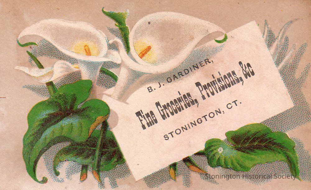 Trade Card, "B.J. Gardiner, Fine Groceries, Provision, &c., Stonington, CT." Byron J. Gardiner had a grocery store at 10 Elm Street in Stonington Borough.