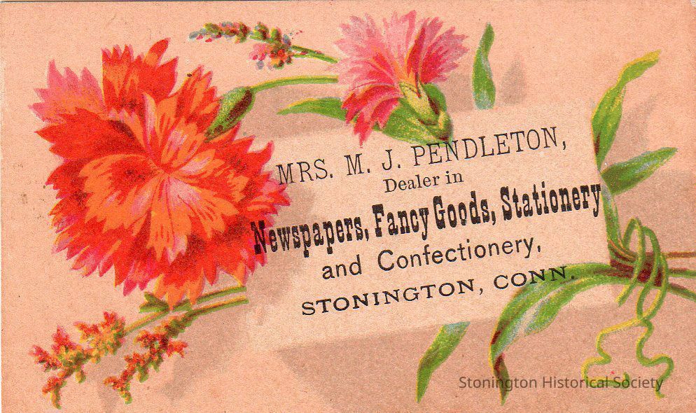 Trade card for Mrs. M. J. Pendleton, Dealer in Newspapers, Fancy Goods, Stationery & Confectionary, Stonington, Conn. Mrs. M. J. Pendleton's newsstand was located at 133 Water Street in Stonington Borough.Collection