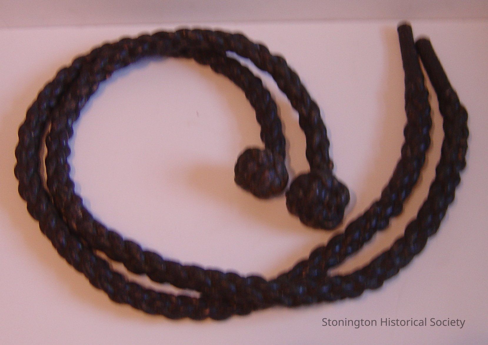 tarred rope, with "monkey fist" knots on one end and finer weaving on the other, possibly used as a boat rail