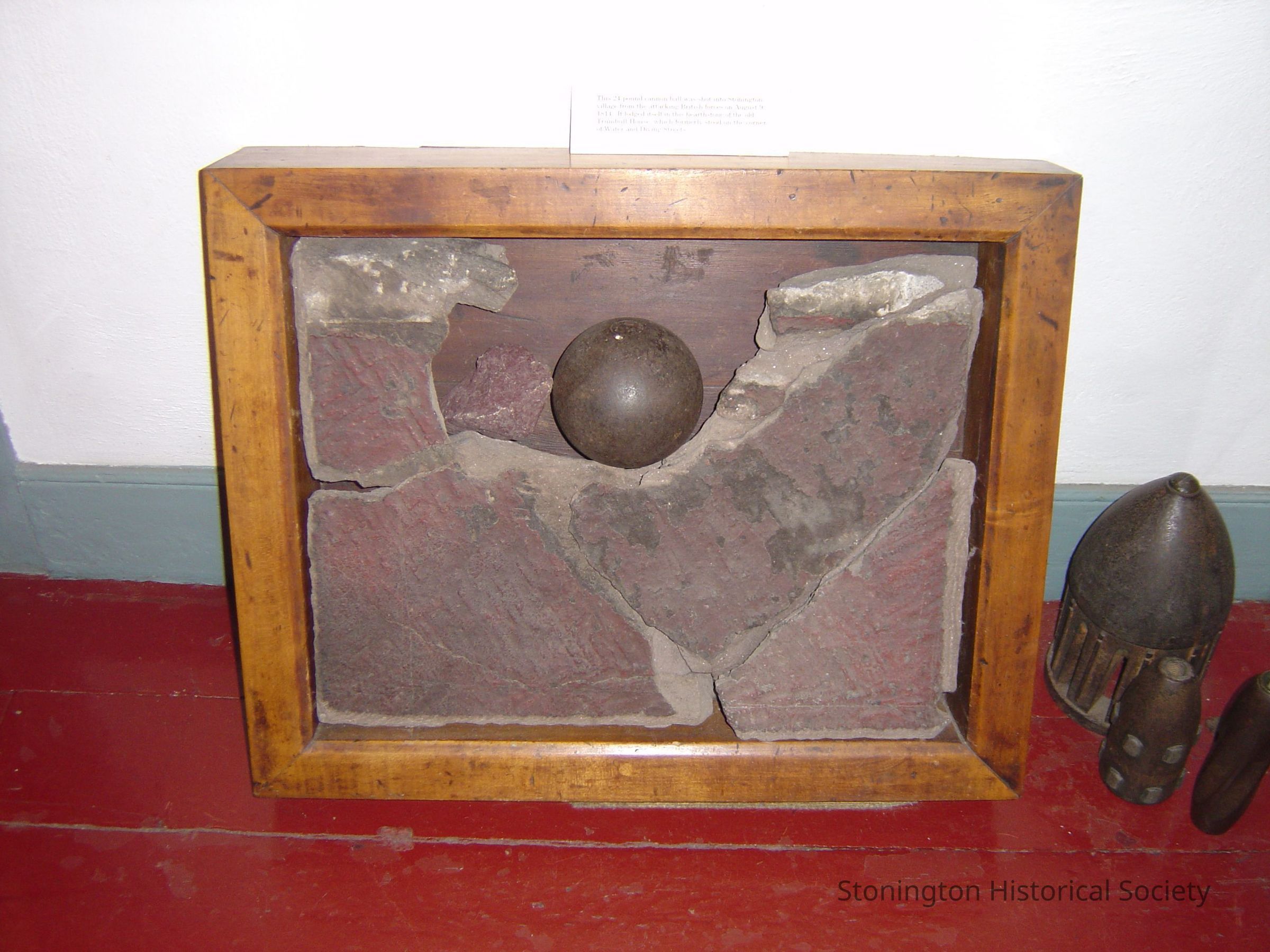 section of hearthstone with 24 lb cannonball, which was shot into the hearthstone of the old Trumbull house on August 9, during that Battle of 1814. In wooden box frame.Collection