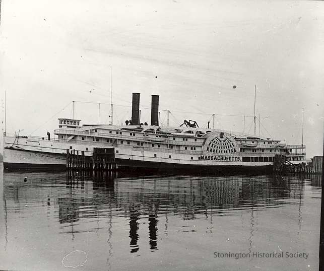 Steamer MASSACHUSETTS at dock MLG-255 has print and negative in section of book titled "Boats, Steamer, Harbor, Breakwater"