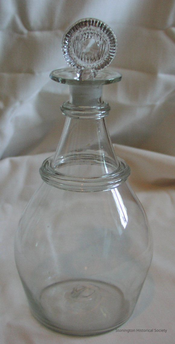 American glass decanter c. 1815, with open pontil scar. The stopper is round with carved edging. Gift of Jonathan Wheeler estate.