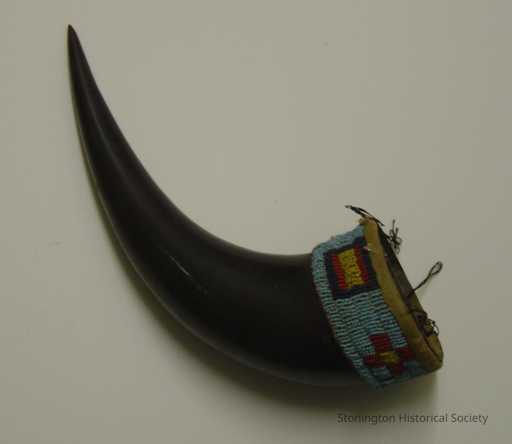 Native American ceremonial horn from the Blackfoot tribe, horn with a black body and a blue &red beaded band