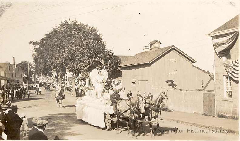 "Victory" float in parade on Elm Street during Celebration of the Battle of Stonington, 1914. Ethel Simmons is named on back as person who portrayed Victory