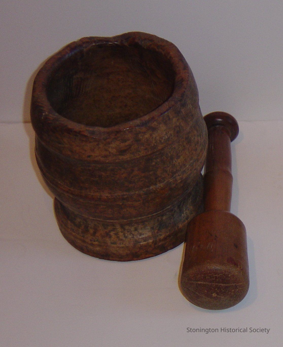 mortar and pestle, design on mortar Gift of A.H. Chesebrough