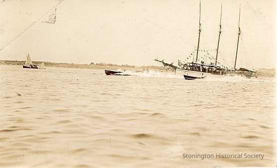 Part of postcard showing boats racing in Stonington Harbor for Battle Celebration, 1914. Per note on back, Class "A" in races. "Ebreba" 3-masted yacht. Harry A. Darlinton Jr. finished 3rd.