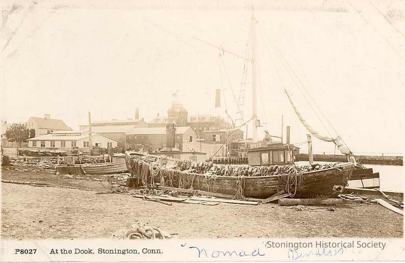 At the Dock, Stonington Conn. Note on back indicates it is the "Nomad" (which blew up) in foreground with other fishing dories and Atwood Machine Co. in distance. Apparently at Gates dock.