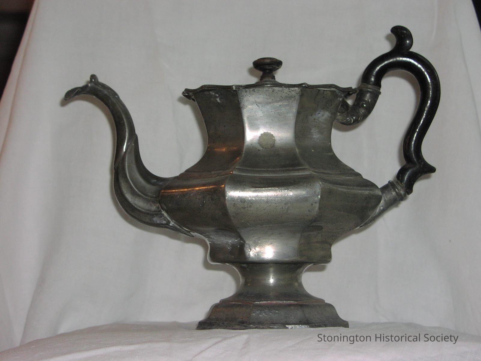 Teapot, Britannia, by James Dixon & Sons, wood handle and top bit on lid (top bit is loose and can be removed), lid is octagonal, one side hinged, rim is scalloped