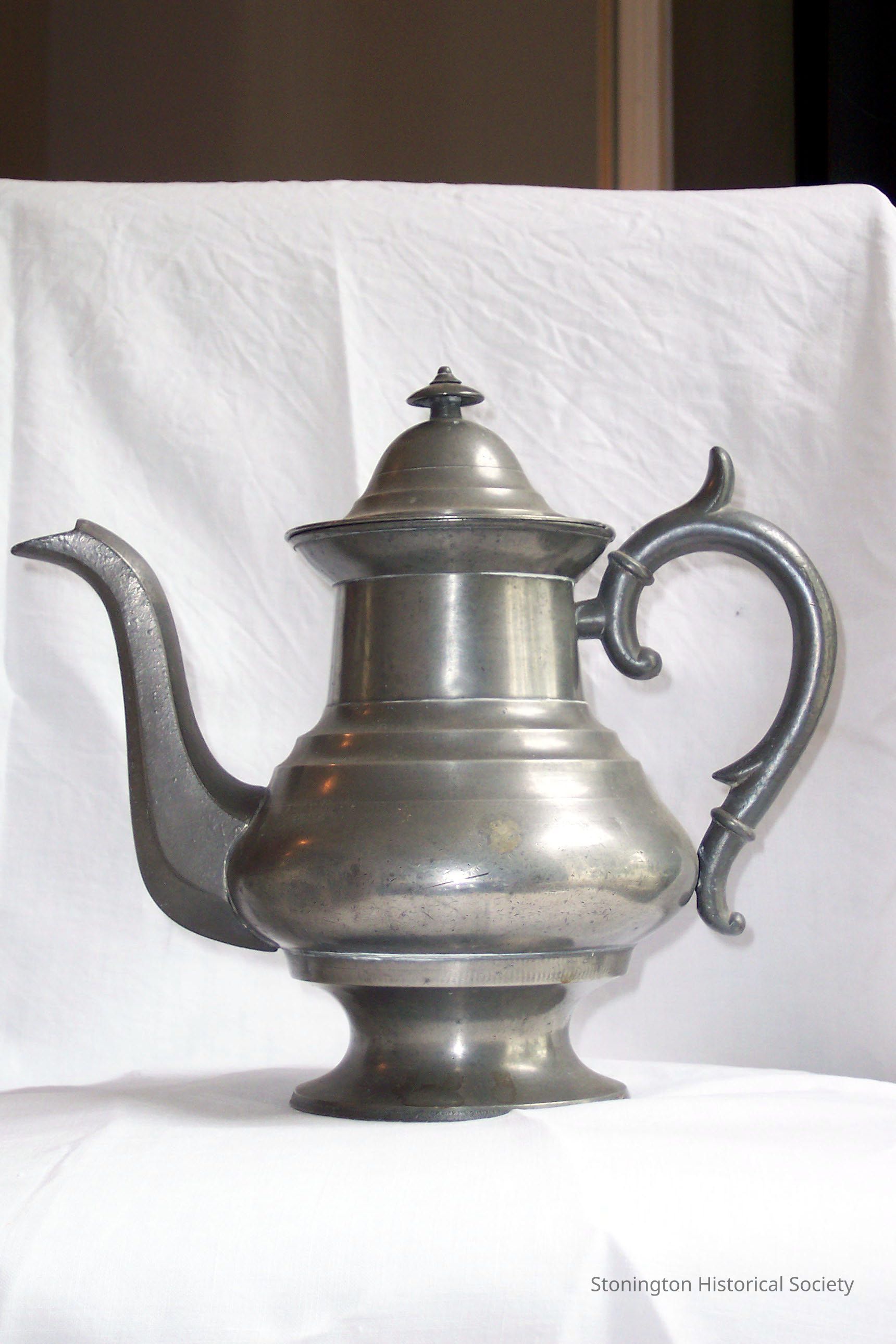 Teapot, pewter, continental style, 10" Piece of paper found inside teapot which says "Continental - C1.163 (0.408) " Circular lid, hinged next to handle