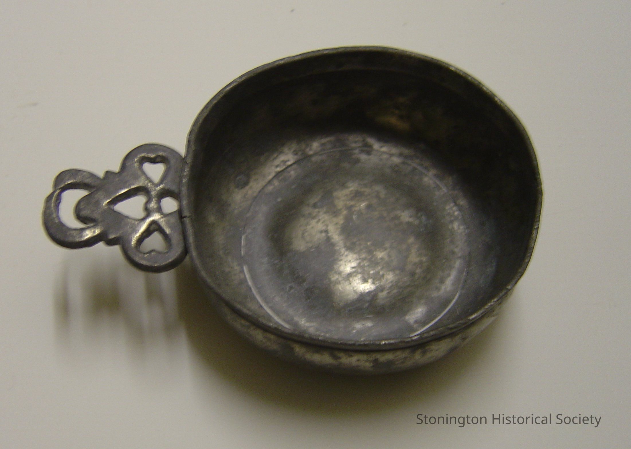 pewter porringer, crudely molded handle, 18th c. *to be moved to Woolworth Library for storage
