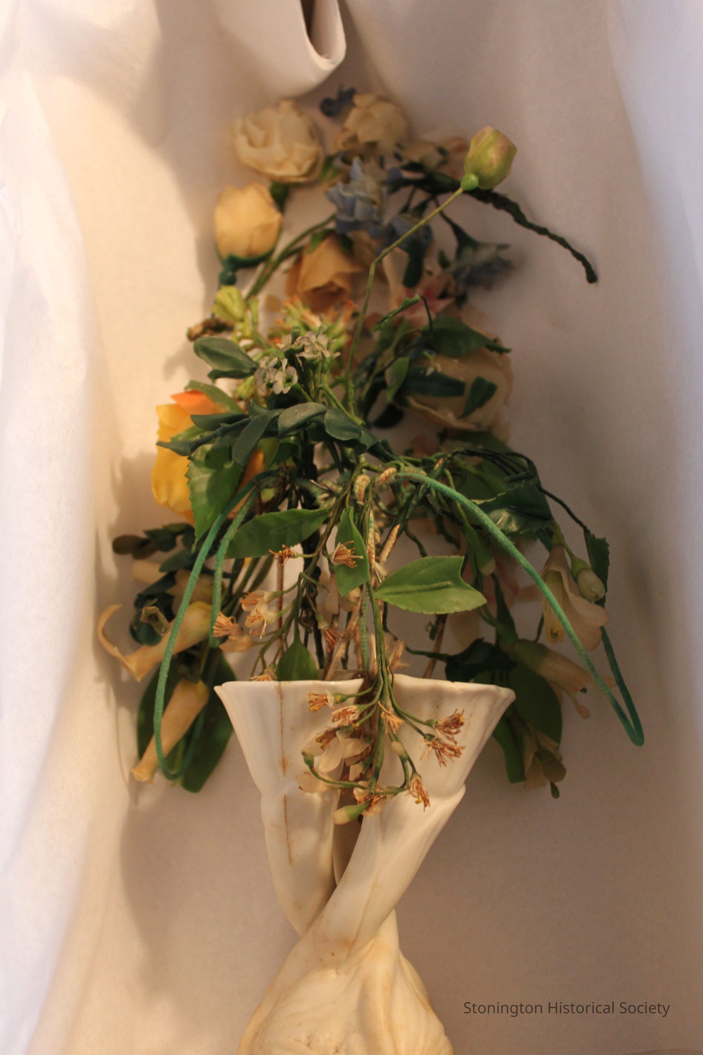 wax flowers, made by Mrs. C.H. Crandall, in a white vase