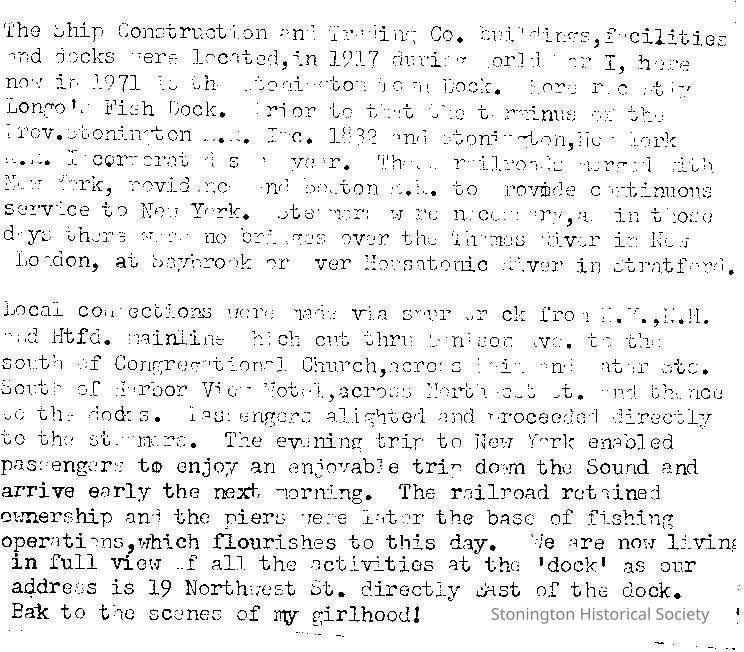 Typed note on the Ship Construction and Trading Co. and transportation in Stonington borough when Dorothea was a childCollection