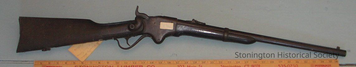 firearm, Spencer Repeating Carbine, 1860, serial #27595, adjustable sight, 22 in. barrel, single shot, original finish blue, inscription on top of breach worn.
