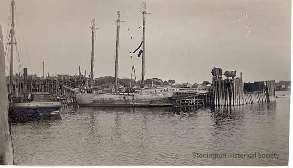 Small photo of Miller showing damage done by submarine midships Notes on back: Bedraggled "Charlotte Miller" after collision and restoration to pristine beauty in 1921. At Steamboat Wharf, Ship Constr. and Trading Co.