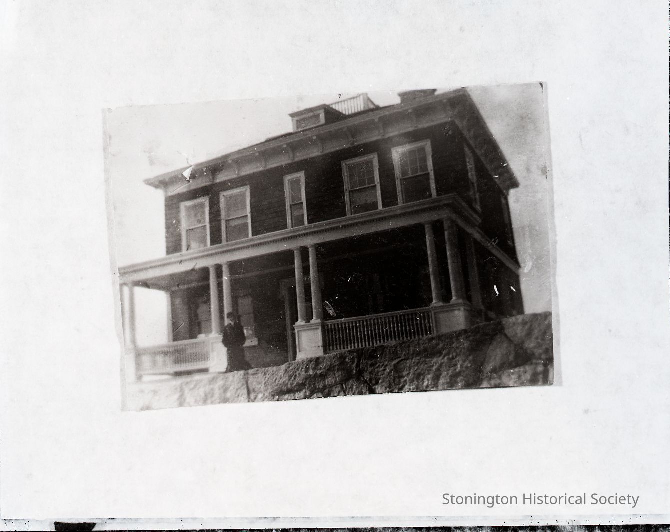 Photo taken of lighthouse keeper's house with stone wall. Same house as previous photo/neg without foliage and from different angle. Person on top steps. Negative was found at the Lighthouse and printed inhouseCollection