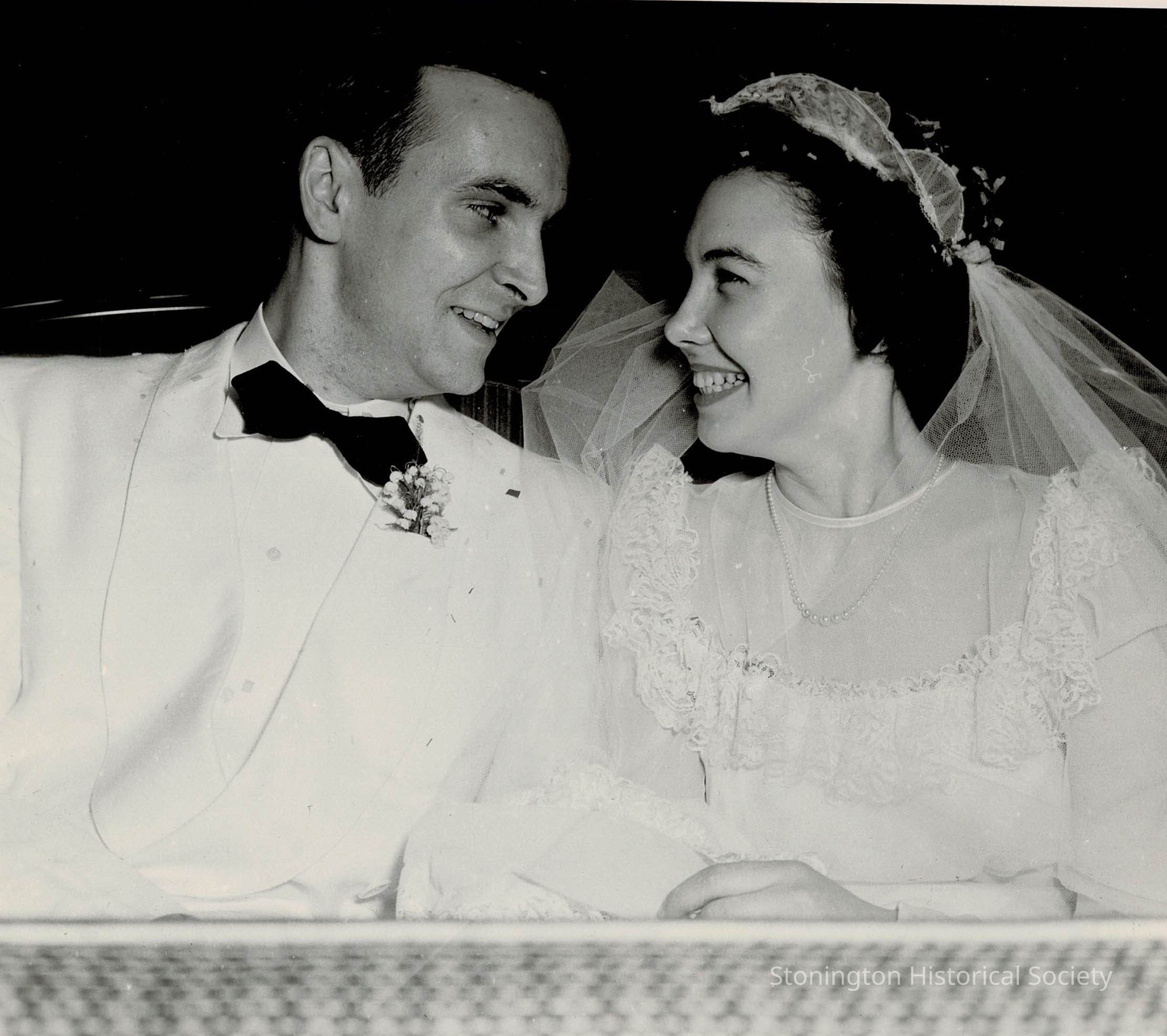 Black and white photograph of Andrew W. Perry (1927-2014) and Eleanor Reilly (1928-2017) on their wedding day, June 3, 1950 in Taunton, Massachusetts. Family story is that this photograph was taken by their driver, after the couple got in and shook the celebratory rice from their clothing. They were married at the Winthrop Street Baptist Church.Collection