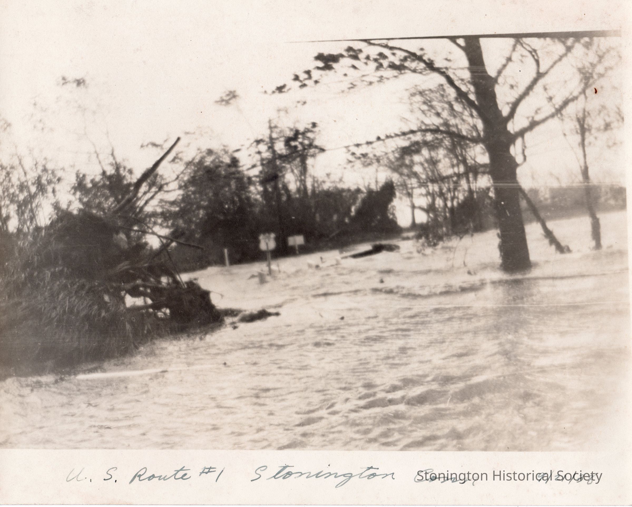 Sepia photograph and black and white copy print, damage along U.S. Route 1 during the 1938 Hurricane. Given to the Society by Harry Northup before his death. With note: "Sheridan's Corner again, looking South. It's hard to believe there was that much water covering the road."Collection