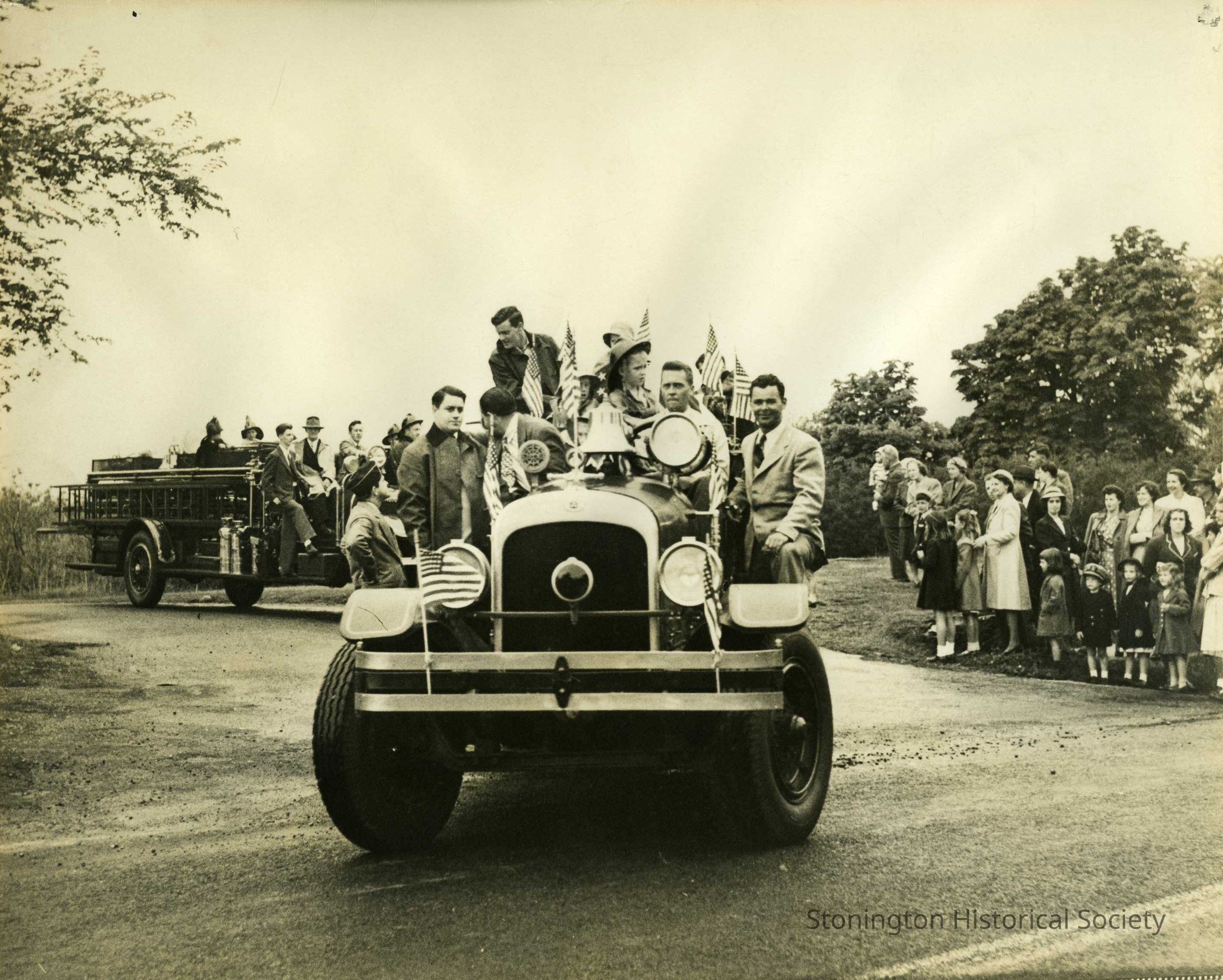Scanned black and white photo of two fire engines on parade route, turning right with people riding on truck and others watching on the side of the road. Memorial Day Parade, leaving Town Hall. First truck was the only Fire District truck that was given to the Neptune Company of the Borough. It was then sold in 1958. On the truck are Mr. Henry Robinson Palmer, Jr., two sons, Mr. Joseph Sharky Fretard, and others.Collection